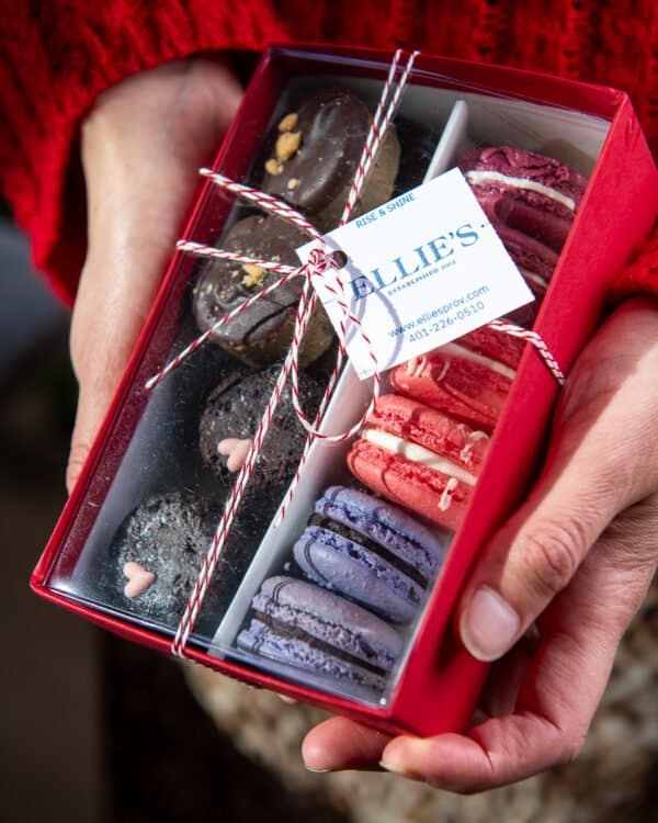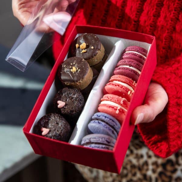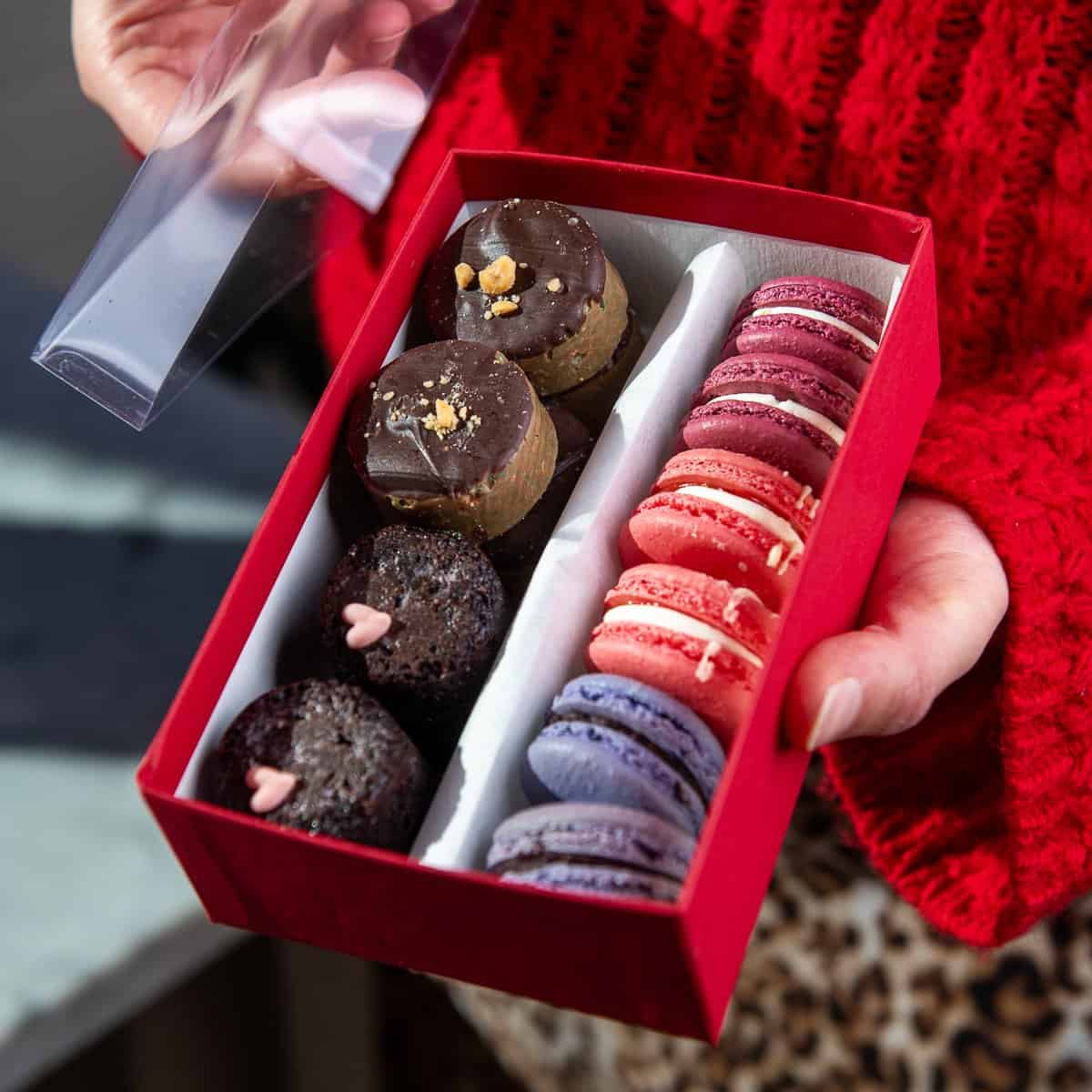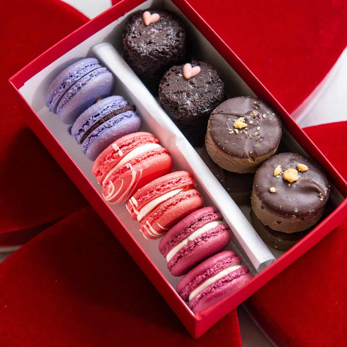 Two (2) chocolate bouchons, two (2) macaron crunch bars, (6) macarons: dark chocolate cassis, raspberry blossom, guava & cream - contains gluten, dairy, nuts, egg