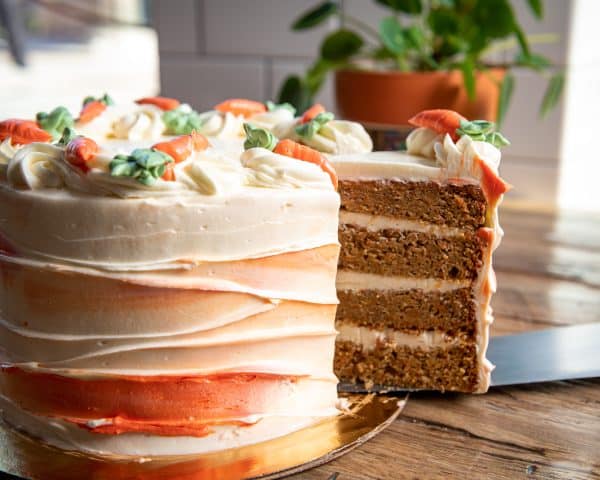 spiced carrot cake, brown butter cream cheese buttercream filling, white chocolate buttercream